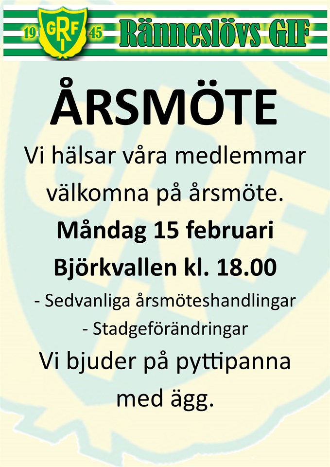 Vi hälsar våra medlemmar välkomna på årsmöte. Måndag 15 februari, Björkvallen kl. 18.00 - Sedvanliga årsmöteshandlingar - Stadgeförändringar Vi bjuder på pyttipanna med ägg. /Styrelsen