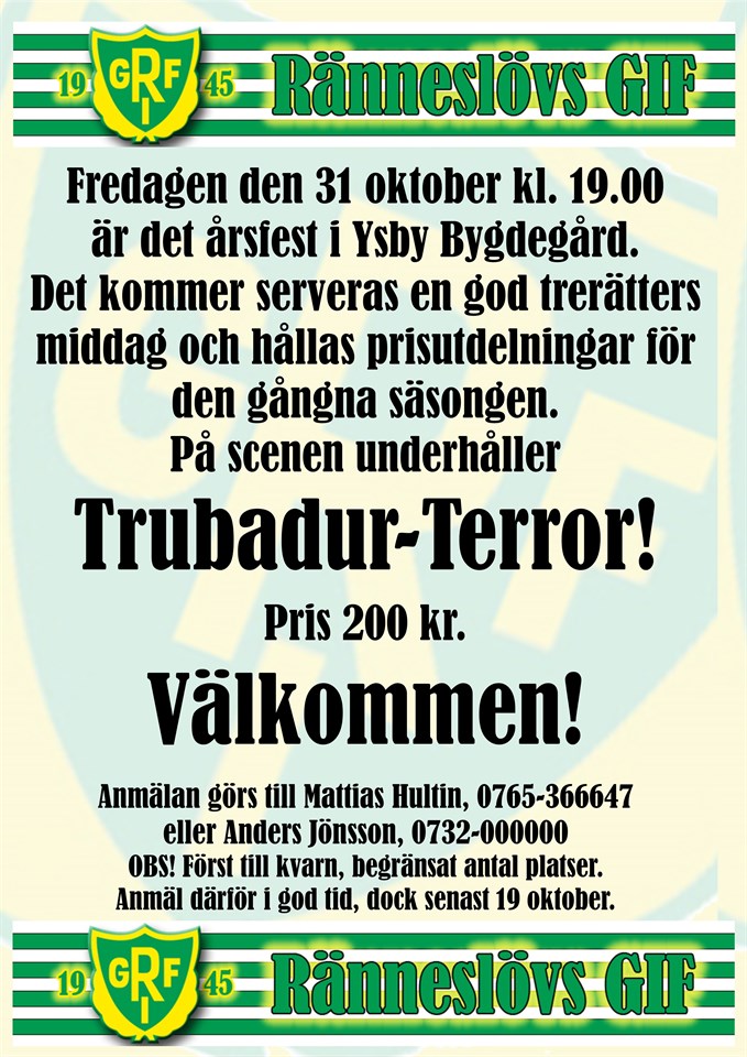 Fredagen den 31 oktober kl. 19.00 är det årsfest i Ysby Bygdegård. Det kommer serveras en god trerätters middag och hållas prisutdelningar för den gångna säsongen. På scenen underhåller Trubadur-Terror! Pris 200 kr. Välkommen! Anmälan görs till Mattias Hultin, 0765-366647 eller Anders Jönsson, 0732-000000. OBS! Först till kvarn, begränsat antal platser. Anmäl därför i god tid, dock senast 19 oktober.