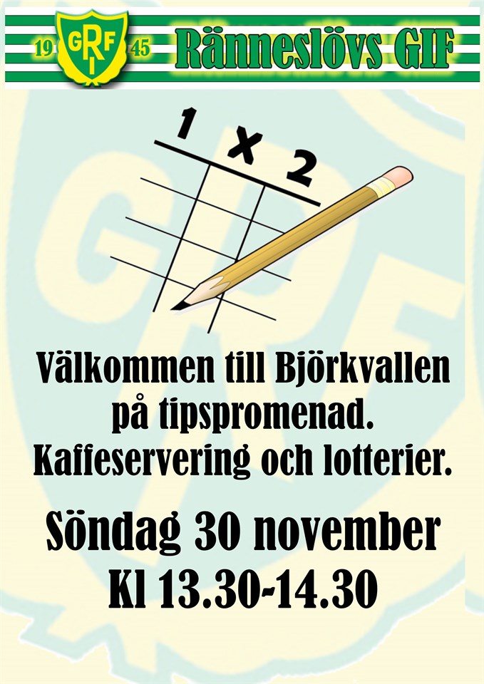 Välkomna till Björkvallen på söndag, den 30 november, på tipspromenad. Vi har även kaffeservering och lotterier. Än en gång, välkomna!