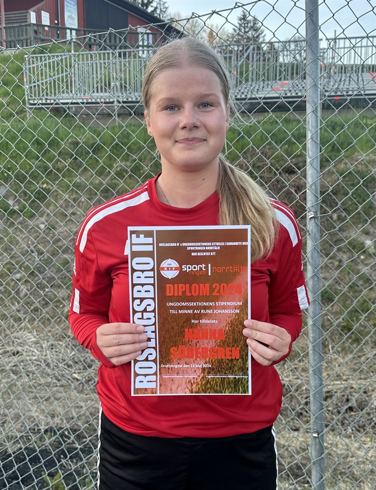 Vi säger STOORT GRATTIS till Hanna Södergren som tilldelats Ungdomssektionens stipendium till minne av Rune Johansson! Motivering: Under 2023 gjorde Hanna stora framsteg i sin mognad och utveckling som fotbollsspelare. Som mittback och defensiv mittfältare har hon med god spelförståelse och stort engagemang varit försvarsdirigent i damjuniorerna. Som lagkapten har Hanna bidragit till många fina prestationer och resultat. Grunden för detta har varit hennes träningsvilja, höga träningsnärvaro, stora engagemang för laget och inte minst hennes fokus på mångsidig utveckling som fotbollsspelare. Damer 15 maj 2024 1kommentar