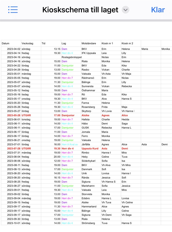 Kioskschemat har uppdaterats då lag har dragit sig ur herrarnas div. 4 serie och damjuniorserien. En ny match har lagts till 1 juli (herr A spelar kval till Svenska cupen). Alla måste gå in och kolla sina tider och om man inte kan sin tid byter man med någon annan på listan. Meddela byten till "kioskmaffian" genom sms till Erin 0705888987. Damer 7 maj 2023 0kommentarer