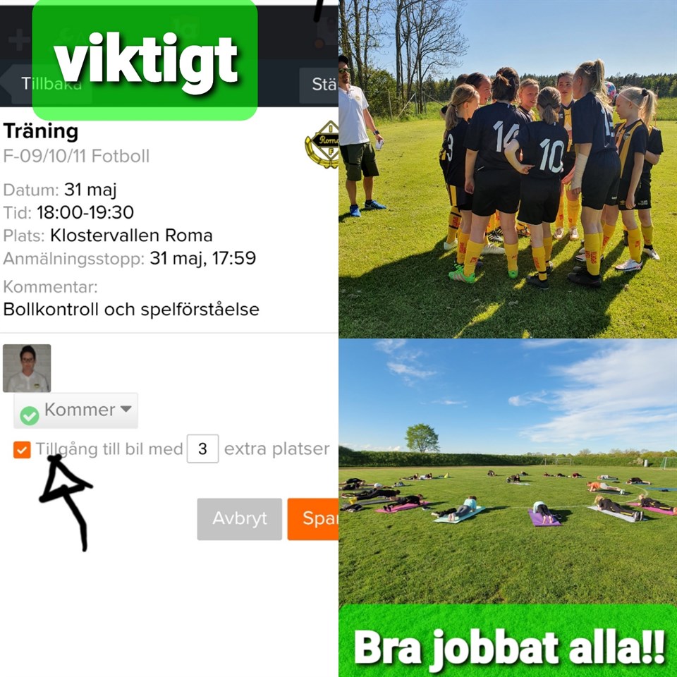 Hej alla! Än engång kul att så många kommer och tränar! Gör det inte lätt för oss att välja ut en trupp till match. Men vi kommer gå på närvaron och sen kommer alla få stå över matcher. Söndagens match I Fårösund så kommer inte någon av oss ledare kunna köra. Vi kommer vara ute på norr hela dagen. Så därför är det jätte viktigt att ni fyller i rätt på anmälan när det gäller bil. Annars blir det jätte svårt för mig att lösa samåknings pusslet! Den lilla bil rutan, klickar man ej i den är det samma sak som att man behöver skjuts. Klickar man i den har man tillgång till egen bil. Och har man extra platser i bilen så fyller man i hur många. Det underlättar jätte mycket för mig och min tid! På måndag 7/6 är det dags igen för att ta med träningsmatta och vanliga gympaskor! Onsdag 9/6 så kommer vi bara träna kl 18-19 då det är dagen innan skolavslutning och vi har ett födelsedags barn hemma (som inte gillar fotboll) F-09/10/11 Fotboll 1 jun 2021 0kommentarer
