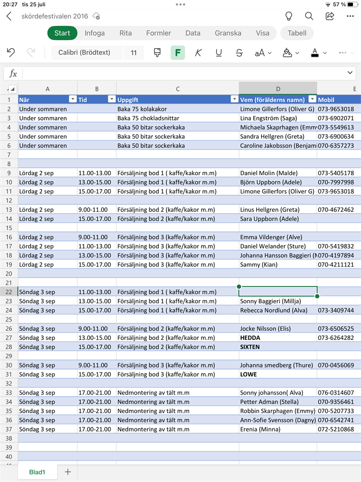 Hej förälder i Pojkar/Flickor-2016, I Roma IF där ditt barn är aktiv och medlem säljer som du vet inte bingolotter, strumpor, korv m.m. Du betalar inte heller en hög medlems- och spelaravgift och behöver inte heller klippa fotbollsplaner, städa Klostervallen o.s.v. Därför ska du som förälder hjälpa till att sköta kiosk vid ditt barns matcher, slåtter i juli/augusti och aktiviteter runt/vid Skördefestivalen. Varför? Ja, för att ditt barn ska ha tillgång till bollar, västar, annan utrustning, lagtröjor, klippta och kritade fotbollsplaner. Roma IF har en vaktmästare som du vet. Lagledarna skickade för en tid sen ut information om att ditt barns lag ska ha lagföräldrar som håller i scheman för kiosk, slåtter och Skördefestivalen vid Grönt Centrum/Lövsta i början av september. Detta har alla lag i föreningen (exklusive alltid det yngsta laget, som just nu är barn födda 2018). Vi som är lagföräldrar i år är Rebecca Nordlund (Alvas mamma) och Frida Adman (Stellas mamma) tills det väljs nya våren 2024. Vi sågs tillsammans med andra lagföräldrar den 24 april för att planera diverse saker kring Skördefestivalen. Igår fick vi lagföräldrar ett schema för detta, som ska vara skickas in till föreningen i slutet av vecka 27. Vi föräldrar i P/F-2016 (*undantag se nedan) ska baka inför, bemanna ett visst antal pass i försäljningsbodar under helgen och riva tält. Ett schema läggs därför upp här så du kan se de tider som laget har att bemanna/baka. Du ska kommentera nedan och en ange vilket pass du vill ha (skriv datum och tid), ert telefonnummer, ert namn och barns namn. Först till kvarn. Vi kommer att uppdatera passen med jämna mellanrum, så man lätt kan se vilka som är tomma. De som inte satt upp sig på fredag 7 juli kommer tilldelas pass och meddelas. Kan du inte är det ditt ansvar att byta med någon annan eller ordna med en ersättare. Vi som lagföräldrar ordnar inte med det. Om du väljer att baka är det viktigt att ingredienser framgår på påsar/burkar du lämnar in. Du ska kunna lämna dina bakverk hos Ante Larsson på Brukshotellet. Du kan välja att baka som sponsring till Roma IF eller lämna in kvitto för ingredienser till Ante Larsson på Brukshotellet. Vad som ska bakas framgår i schemat. För att förtydliga så arbetar du ett pass antingen bakar, säljer eller river tälten. *Undantagna: Föräldrar till Maja, Vilja, Dustin, Oliver G, Mira och Adele eftersom minst en av föräldrarna är ledare och därmed redan lägger mycket ideell tid i föreningen.