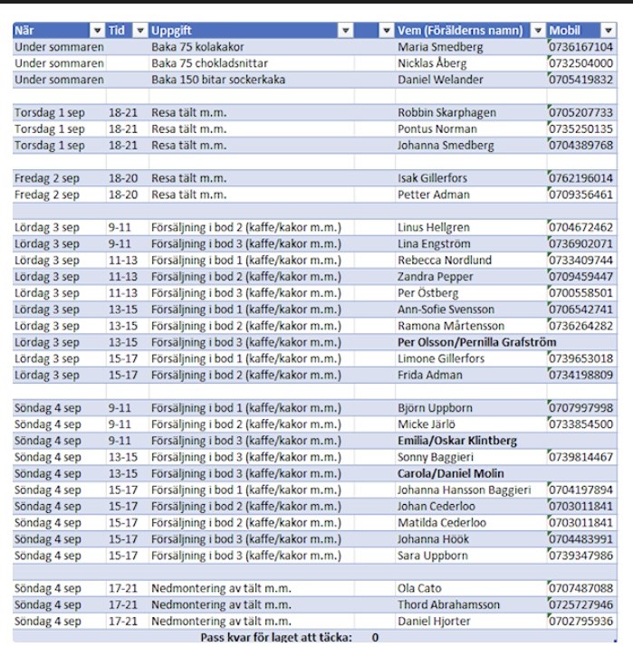 Hej! Lägger ut schemat igen för våra pass. Ni som ska baka fick en uppdatering igår om lämning av sockerkakor och kakor. Kom ihåg att skriva ingredienser. Ni som ska resa tält har pass torsdag eller fredag. Ni som ska stå i försäljningsbod har pass lördag eller söndag. För att få en smidig överlämning i bodarna är det bra att man kommer i tid. Ni som ska ta ner tält har pass söndag. Påminner om att man ansvarar för att komma till sitt pass samt att hitta eventuell ersättare/byta om man inte kan. Önskar alla en trevlig marknadshelg! Sara o Eleonore P/F-9 Fotboll 30 aug 2022 0kommentarer