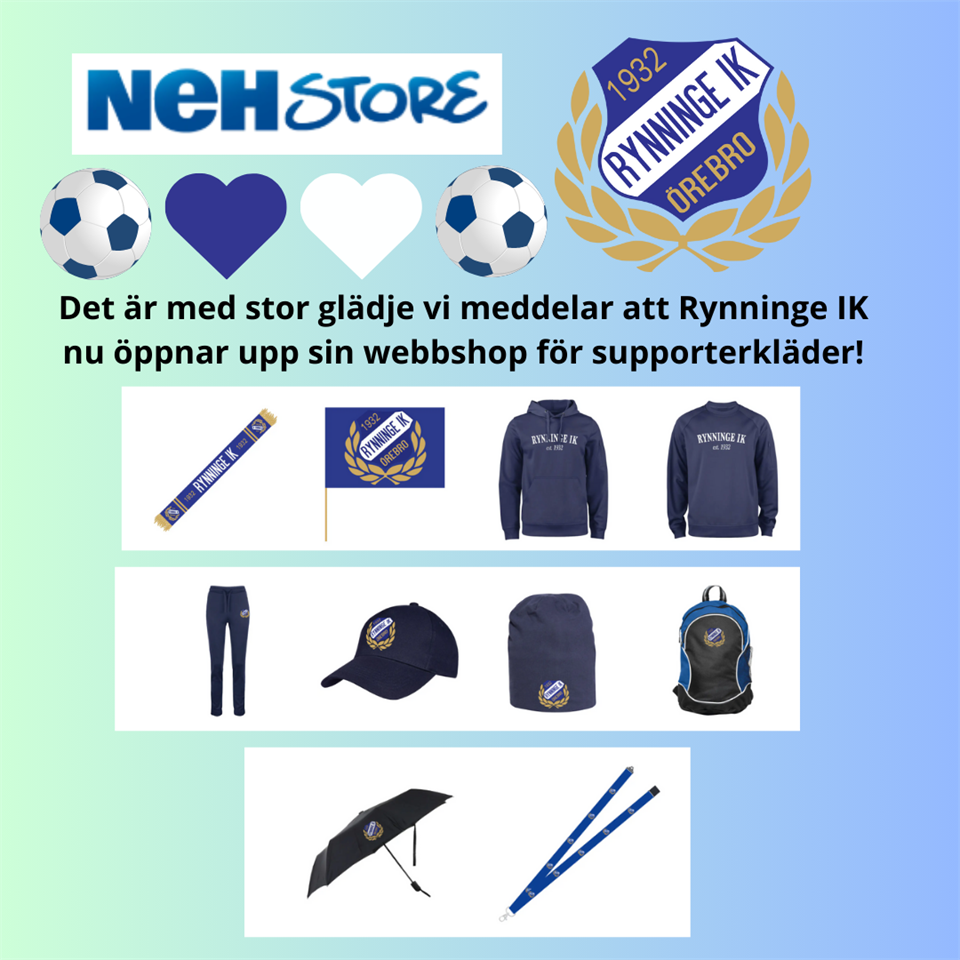 Det är med stor glädje vi meddelar att Rynninge IK nu öppnar upp sin webbshop för supporterkläder! Detta är en fantastisk möjlighet för alla medlemmar, från spelare till föräldrar och vänner, att visa sitt stöd och sin kärlek till föreningen. Genom att bära våra färger blir du inte bara en del av Rynninge IKs stolta traditioner, utan också en viktig del av vår gemenskap. Vi uppmanar alla att ta del av detta unika tillfälle att stärka banden inom föreningen och att tillsammans heja fram våra lag på planen. Så, låt oss klä oss i Rynninge IK´s supporterkläder och tillsammans skapa en atmosfär som ingen kan motstå! Ett sätt att umgås! Klicka på länken för att komma till webbshopen: NEH WEBBSHOP Eller klicka på ikonen till höger på hemsidan för att komma till webbshopen. Övrig info: -Du kan besöka NEH shopen på Radiatorvägen 2 i Örebro för att se produkterna. -När du beställer på webben så lägger du dina varor i kundkorgen (leverans inom 10 arbetsdagar). -Du kan välja att hämta varorna själv i butik NEH (Radiatorvägen 2) eller betala frakt 75 kr och hämta på utlämningsställe. -Du kan betala med Klarna, Visa, Mastercard, Swish m.m Snart kommer det också finnas vissa produkter i klubbhuset som man kan titta närmare på. Vid frågor kontakta Tommy eller Styrelsen