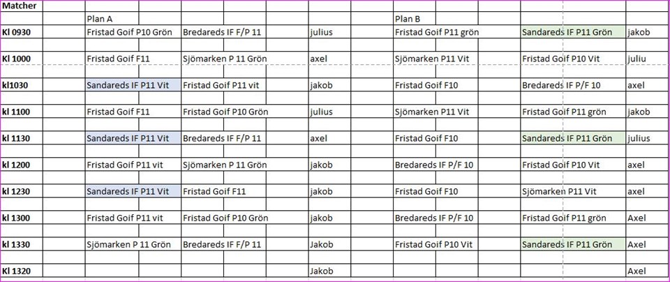 Här är uppdaterat matchprogrammet för lördagens minisammandrag i Bredared. OBSERVERA: två olika samlingstider pga att första matcherna är olika tider Laguppställningen ser ut enligt nedan: Lag vit - SAMLING 10.00 I BREDARED VID OMKLÄDNINGSRUMMET Lagledare: Micke Eriksson och Johan Strandqvist Spelare: Carl Juneberg, Erik Willhammar, Lionel Hanson, Oliver Eriksson, Melwin Källgren, Victor Strandqvist, Liam Lindh, Joel Frömo, Vilmer Lybacken Lag grön - SAMLING 8.30 PÅ SANDEVI Lagledare: Richard Sohlin och Helen Levinson Spelare: Charlie Werner, Kevin Mohlin, Ture Nyman, Olle Sohlin, Vilgot Backaro, Måns Tull, Theo Neugebauer, Nicholas Walleräng Matcherna spelas med 5 spelare på plan (1 målvakt, 4 utespelare, + reserver (fria byten)). Lag vit spelar sina matcher kl 10,30, 11,30 och 12,30. Lag grön spelar sina matcher kl 9,30, 11,30 och 13,30. Samåk gärna med varandra eftersom parkeringsmöjligheterna är begränsade. Vi har med oss Sandared IF´s matchställ som killarna kommer att få byta om till när vi kommer fram till Bredared. Har ni frågor så hör gärna av er till någon av oss tränare eller prata med oss på träningen.