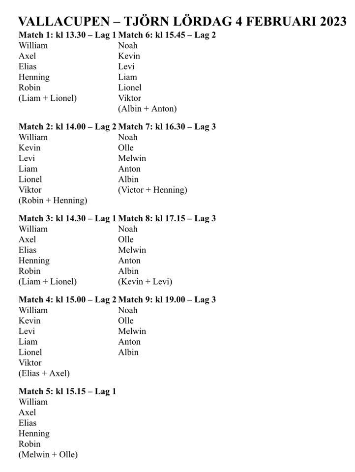 Nu har vi tillslut lyckats få ihop ett spelschema där alla får spela 4 eller 5 matcher. Öppna bifogad fil för tider. Bra om ni är på plats 45 minuter innan matchstart. Räkna med ca 1.30 i restid (10mil). Kommer finnas café att köpa lunch, fika. Blir riktigt roligt det här tycker vi, ses på Tjörn! P11 31 jan 2023 0kommentarer