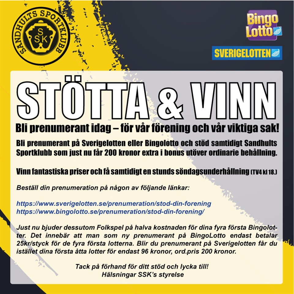 Köp bingolotter. Kopiera in länken nedan i din webbläsare så kommer du direkt till försäljningen och du gynnar Sanndhults Sportklubb. https://www.bingolotto.se/bingolotter/?customerId=1021170