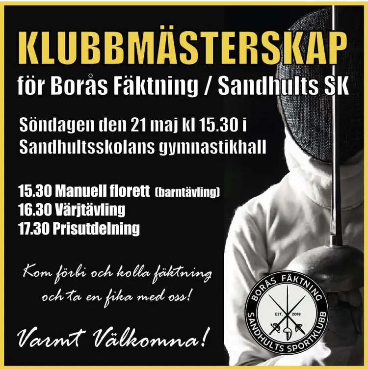 Söndagen den 21 maj kl 15:30 i Sandhultskolans gymnastikhall. 15:30 Manuell florett (barntävling) 16:30 Värjtävling 17:30 Prisutdelning Kom och kolla fäktning och ta en fika med oss! Varmt välkomna Sandhults SK 15 maj 2023 0kommentarer