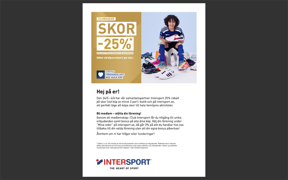 Hej Välkomna på Clubbdagar på intersport. Den 24/5–4/6 har vår samarbetspartner Intersport 25% rabatt på skor (vid köp av minst 2 par) i butik och på intersport.se, ett perfekt läge att köpa skor till hela familjens aktiviteter. Bli medlem – stötta din förening! Genom ett medlemskap i Club Intersport får du tillgång till unika erbjudanden samt bonus på alla dina köp. Välj din förening under ”Mina sidor” på intersport.se, då går 3% på allt du handlar hos oss tillbaka till din valda förening utan att din egna bonus påverkas! Sandhults SK 25 maj 2023 0kommentarer