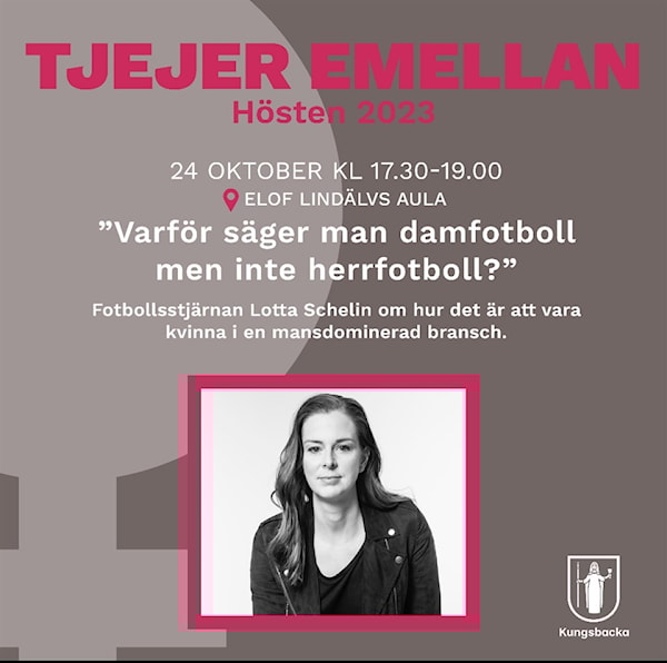 Tisdagen den 24/10 kl. 17.30-19:00 kommer Lotta Schelin till Tjejer emellan på Lindälvs aula och pratar om jämställdhet inom idrotten. Föreläsningen riktar sig till unga tjejer i åldrarna 12–20 år och är kostnadsfri.