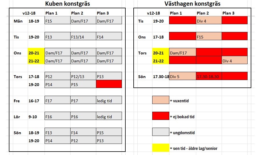 Till kommande konstgrässchema v19-40 så kommer jag att ta hänsyn till era matchdagar och försöka få ihop i största möjliga mån så det inte blir tex match söndag och träning måndag.