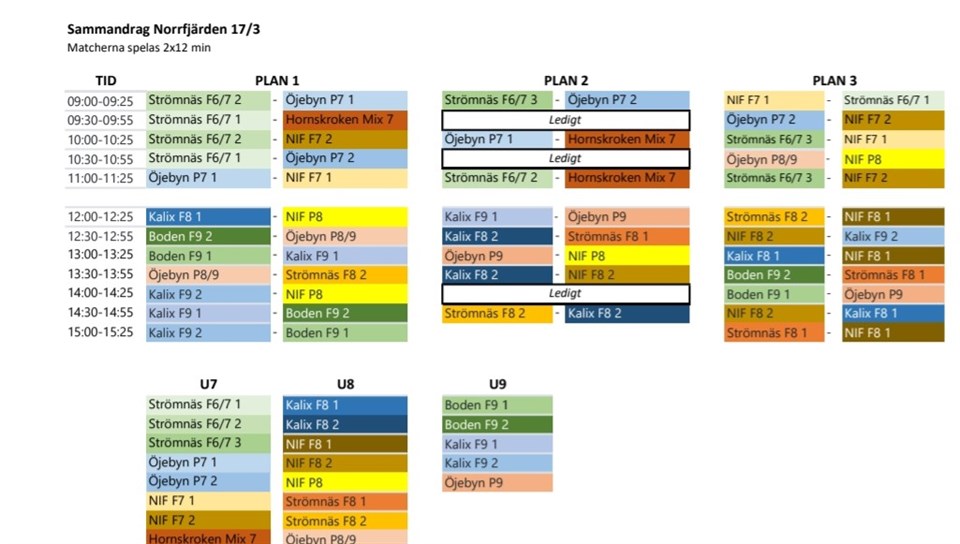 Obs: Uppdatering kommer ang lag. Spelschemat för sammandraget i Norrfjärden 17/3 har kommit! Vi spelar med 3 lag och matcherna är mellan kl 09.00 och slutar 11.25, dvs innan lunch! Vi samlas allihop kl 08.30, dvs 30 min innan första matchen. Då delas tröjorna ut och vi värmer upp. Obs: uppdatering kommer med lag. Handbollsskolan (2019) 9 mar 2024 1kommentar