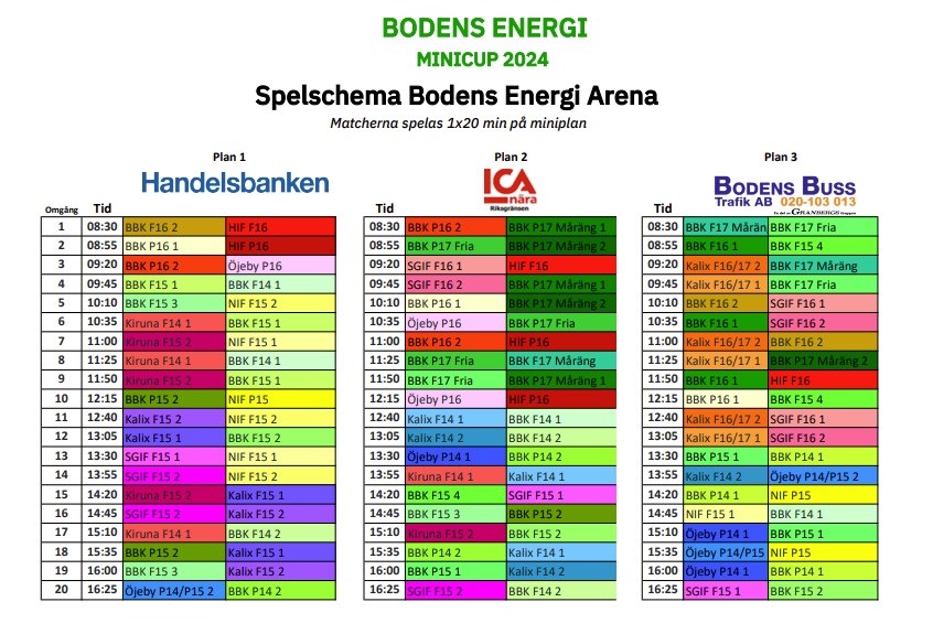 Bodens Energi Minicup 17/2 Dag: Lördag 17/2 Plats: Boden Energi Arena. (OBS!) Samling: Vi har en gemensam samling för båda lagen kl 08.50, dvs 30 min före allra första matchen. Därefter 15 min för resterande matcher. Vi delar ut tröjor vid samlingen. Vi går in Entré, Spelare, ledare - via ingång markplan (B). Omklädningsrum är uppmärkta med respektive lag och förening. Speltid 1x20 minuter Lag 1: Selma Märta Mercedes Alice Sofia Tilde Majken Lag 2: Siri Ebba Linn Agnes Majlis Tora Rut Spelschema SGIF F16 lag 1: 09.20 HIF F16. Plan 2. 10.10 BBK F16 lag 1. Plan 3. 12.40 Kalix F16/17 lag 2. Plan 3. Spelsschema SGIF F16 lag 2: 09.45 BBK P17. Plan 2. 10.35 BBK F16 lag 1. Plan 3. 13.05 Kalix F16/16 lag 1. Plan 3. I foajén kommer det att finnas försäljning av kaffe, läsk , festis, godis, fikabröd, frukt, varma klämmackor, korv och hamburgare. Även lotteri. Som vanligt uppsatt hår, inneskor, vattenflaska. tejpade eller avlägsnade örhängen. Mellan matcher är det föräldraansvar över sitt barn. Se gärna till att de får i sig bra med mat inför match. Då det är sjukdomstider så ber vi er meddela oss via gästboken på laget.se så snart ni kan om det blir förhinder/sjukdom. Kan hända att vi måste låna spelare mellan lagen så vi ser gärna att ni är kvar på plats och hejar på varandra. :) Hoppas tjejerna är taggade inför en dag med handboll! Fokus är som alltid att ha roligt och kämpa tillsammans! //Tränarna Lisen, Jeanette och Lina