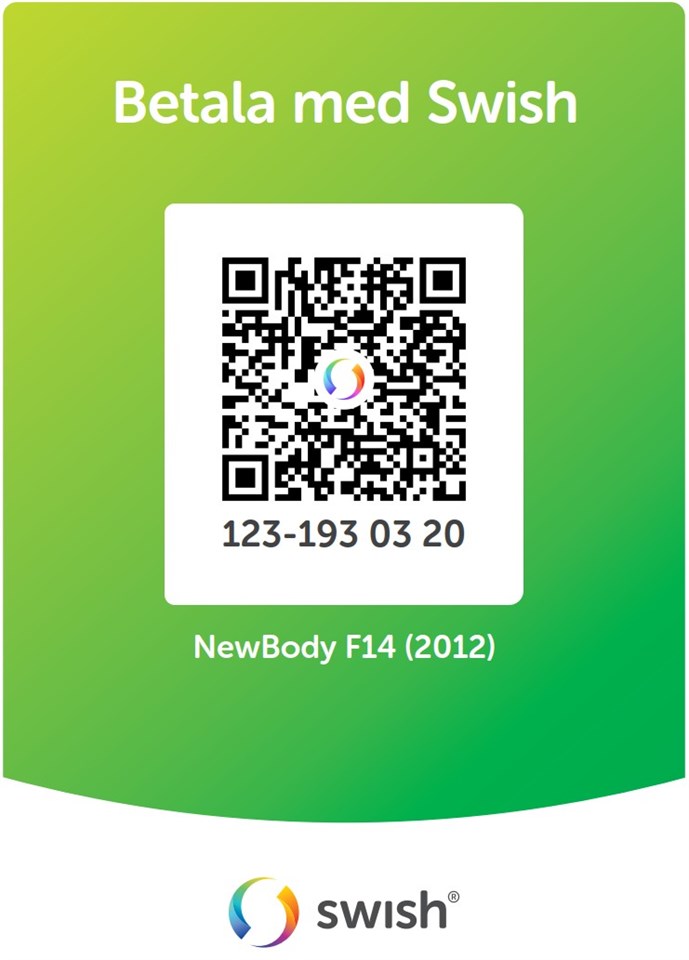 Här kommer instruktioner hur ni betalar NewBody när ni sålt klart. Paketen kommer att levereras till Pitholmssporthall och delas ut där vid ert lags träning, eller överenskommen tidpunkt. Där kommer det att finnas en QR kod för varje lag som ni scannar. Det kommer att stå en förtryckt text i meddelandefältet, ändra inte den utan skriv bara barnets namn efter texten. Vid friköp, använder ni samma QR kod, men skriver FK, efter den förtryckta texten och före barnets namn. Exempel: NewBody F16 (2010) Anna Andersson eller NewBody F16 (2010) FK Anna Andersson Stäm av med Lagkassörerna som kommer att få en sammanställning på hur mycket var och en är skyldig och kan bocka av er i listan. Ni kan ävan använda er av QR-koden i detta meddelamde.