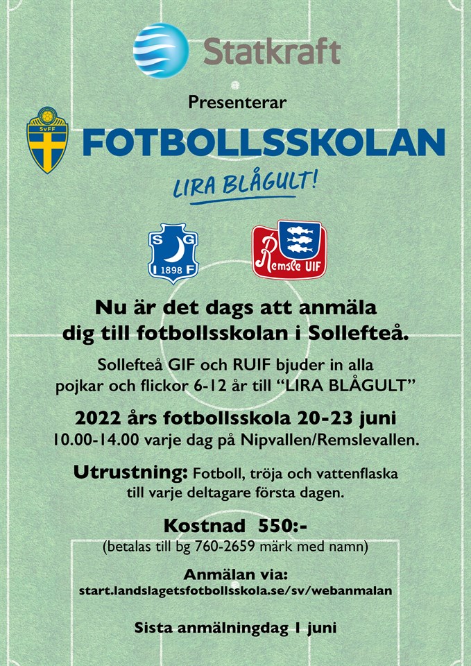 Sollefteå GIF och Remsle UIF bjuder även i år in till fotbollsskola. Som vanligt är det veckan före midsommar (20-23 juni) måndag till torsdag mellan 10.00-14.00 varje dag. Deltagarna (får vara mellan 6 och 12 år) tar själva med sig en lättare lunch att ätta mitt på dagen. Instruktörer blir pojkar och flickor GIF och RUIF. Anmälan sker på länken nedan och sedan är det bara att klicka sig fram till Västernorrland och fotbollsskolan i Sollefteå och anmäla. Kostanden är 550 kr och förutom själva träningarna ingår en boll, en flaska och en T-shirt i priset. Se till att skriva in storlek på T-shirt vid anmälan. Pojkarna håller till på Nipvallen och flickorna på Remslevallen. Anmälan bör man göra så fort som möjligt men anmälan håller öppet till 8 juni https://start.landslagetsfotbollsskola.se/sv/webanmalan U16 11 maj 2022 0kommentarer