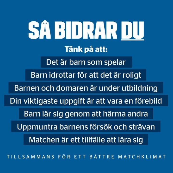 HUR ÄR DU SOM FÖREBILD PÅ MATCHEN? ⚽🙌 Helgen 18–19 maj kommer Svenska Fotbollsförbundet, distrikten m.fl. att kraftsamla för att på olika sätt manifestera för ett bättre matchklimat inom svensk fotboll. Syftet är att gemensamt gå ihop och visa på att det är viktigt med ett bra klimat kring alla fotbollsplaner framåt. Svensk fotboll strävar efter mer än bara segrar på planen. Fotbollen ska vara en plats för glädje och gemenskap. Här finns ingen plats för hat, hot och våld. Det är genom positiv förstärkning, när vi lyfter, stöttar och peppar, som vi når nya höjder tillsammans. Den här helgen sker en gemensam kraftsamling på anläggningar och arenor runt om i landet, från barn- och ungdomslag hela vägen upp till de högsta serierna. Samtliga tjugofyra distrikt är engagerade. Spelare, föräldrar, ledare, supportrar och domare - alla är viktiga i arbetet för att skapa ett bättre matchklimat och ännu bättre fotboll. Läs mer på Svenska fotbollsförbundets hemsida. You Tube-klipp: "Tillsammans för ett bättre matchklimat" "SvFF:s general: Viktigt att vi visar hit men inte längre i svensk fotboll"