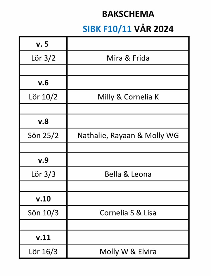 Har gjort ett schema över när det är dags för er att baka inför lagets hemmamatcher. Ni väljer själva om man bakar själv eller köper något. Om man inte kan eller får förhinder så ansvarar ni själva för atr byta datum med någon annan på listan. Hälsningar Lisa F10-11 28 jan 2024 6kommentarer
