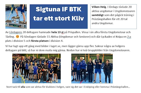 Vilken Helg. I lördags tävlade 20 aktiva ungdomar i Ungdomstouren i Enköping samtidigt som det pågick träning i Prästängshallen för ett 20 tal andra Ungdomar.