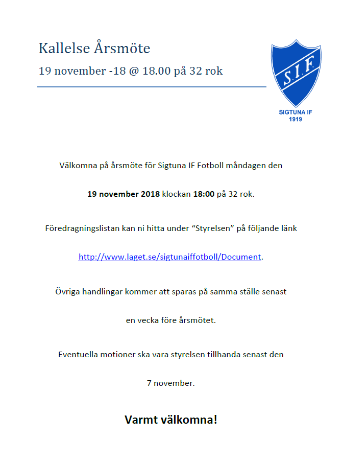 Välkomna på årsmöte för Sigtuna IF Fotboll måndagen den 19 november 18:00 på 32 rok. Föredragningslistan kan ni hitta under "Styrelsen" på följande länk http://www.laget.se/sigtunaiffotboll/Document. Övriga handlingar kommer att sparas på samma ställe senast en vecka före årsmötet. Eventuella motioner ska vara styrelsen tillhanda senast den 7 november. Skickas till Styrelsen Varmt välkomna! /Styrelsen Sigtuna IF Fotboll