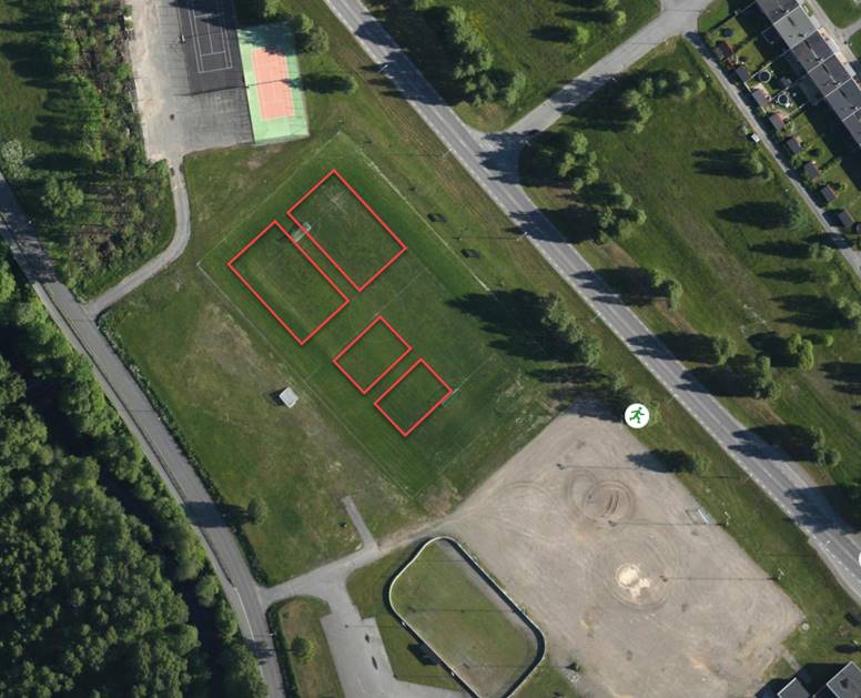 Den tidigare 11-manna planen kommer att göras om till två 5-manna och två 7-manna planer enl.bild. Det kommer dock endast vara vid enstaka tillfällen som båda planerna av samma storlek behöver användas samtidigt och det kommer aldrig att spelas match samtidigt på båda planerna. Önskvärt är att lagen varvar användandet av planerna så att gräset håller längre. Initialt kommer endast en uppsättning målburar för 5-manna att finnas på plats så de behöver flyttas för att nyttja båda planerna lika mycket. Planerna kommer endast att användas av SIK-80 lagen.