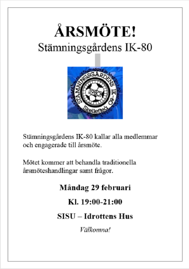 Stämningsgårdens IK-80 kallar alla medlemmar och engagerade till årsmöte. Mötet kommer att behandla traditionella årsmöteshandlingar samt frågor. Måndag 29 februari Kl. 19:00-21:00 SISU – Idrottens Hus Välkomna! Stämningsgårdens IK 8 feb 2016 1kommentar