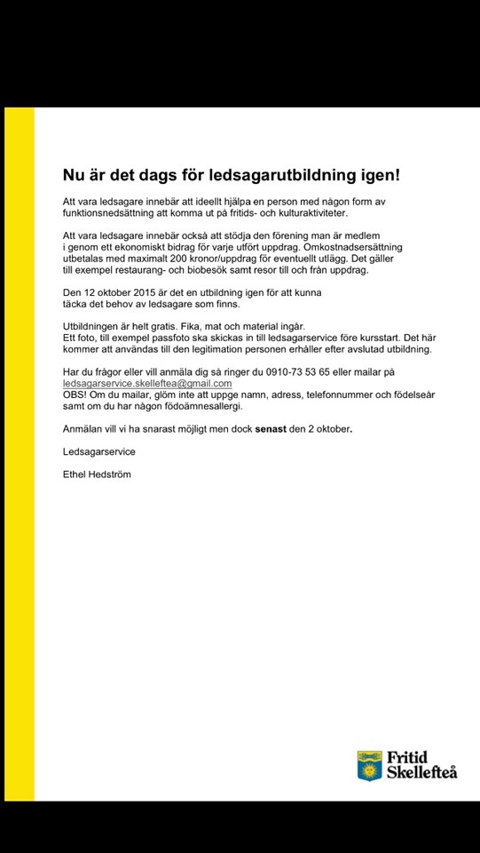 Hej! Nu har föreningen chansen att anmäla någon person till höstens ledsagarutbildning. Att vara ledsagare innebär att ideellt hjälpa en person med någon form av funktionsnedsättning att komma ut på fritids- och kulturaktiviteter. Utbildningen är helt gratis. Fika, mat och material ingår. Anmäl dig senast 2 oktober 2015. /Utbildningsansvarig