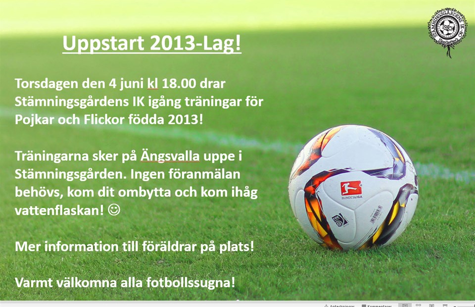 Äntligen! Nu är det dags för barnen födda 2013 att börja lira! Torsdagen den 4 juni kl 18.00 drar vi igång träningar för Pojkar och Flickor födda 2013! Träningarna sker på Ängsvalla uppe i Stämningsgården. Ingen föranmälan behövs, kom dit ombytta och kom ihåg vattenflaskan! :) Mer information till föräldrar på plats! /Styrelsen Stämningsgårdens IK 31 maj 2020 0kommentarer