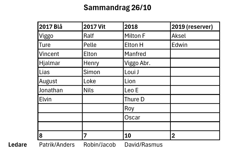 Hej, På lördag är det äntligen dax för sammandrag för er som anmält er. Samling i hallen för samtliga spelare kl. 12.00. Vi håller på att ordna med omklädningsrum. Se till att barnen ätit bra frukost/lunch innan och ta gärna med ett mellanmål t.ex. macka, banan eller risifrutti att fylla på med under pausen mellan match 2 och 3. Inget godis eller läsk. OBS! Glöm inte vattenflaskan. I bifogad bil ser ni vilket lag ert barn är med i och vilka ledare som ansvarar för respektive lag. Spelschema med tider och vilka planer matcherna spelas på kommer i ett separat inlägg. Om man blir sjuk etc. och inte kan vara med på lördag så tar ni kontakt med ledare för respektive lag så fort som möjligt. Ni föräldrar som ska hjälpa till med kafeterian, sekretariat och bygga sarg samlas samma tid. Ta kontakt med någon av oss ledare när ni kommer. Om ni har några funderingar är det bara att ta kontakt med någon av oss ledare alt. kommentera detta inlägg. //Ledarna Hockeyskolan 24 okt 2024 0kommentarer