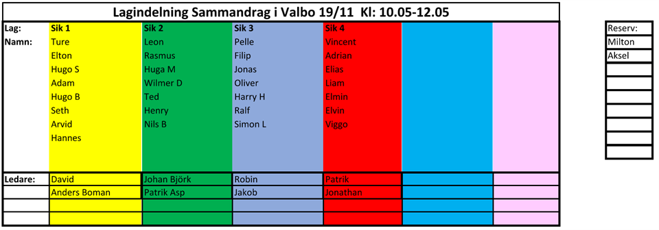 Hej Här kommer lite information inför sammandraget i Valbo på söndag 19/11. Vi kommer ställa upp med 4st lag, se lagindelning i bilden. Det var många som ville vara med och spela, vilket gjorde att alla inte kan vara med. Dom som inte är med kommer att vara reserver och får vara med vid återbud. Kommer man inte kunna vara med så meddela det till någon av ledarna så fort som möjligt så får någon annan chansen. (Vi har prioriterat barn födda 2016-2017). Sammandraget pågår mellan kl. 10.05 – 12.05. Vi samlas kl. 9.00 på plats i Nickback arena i Valbo. Sök upp ledare för respektive lag ni är med i när ni kommer. Det kommer spelas 3-4 matcher med speltid på 1x15 min. Matcherna spelas 3 mot 3 + målvakter. Det kommer bli en lite längre paus mellan match 2-3 där barnen kan äta någon frukt eller dyl. och få i sig lite energi. I pausen kommer alla vara kvar på isen/båset, så man får lämna frukt mm till respektive ledare för laget innan i omklädningsrummet. Glöm inte vattenflaskan! Är det något som är oklart är det bara att ta kontakt med någon av oss ledare. För er som inte är med på sammandraget är det träning som vanligt mellan kl. 10-11. Ledare kommer finnas på plats. /Ledarna Hockeyskolan 14 nov 2023 0kommentarer