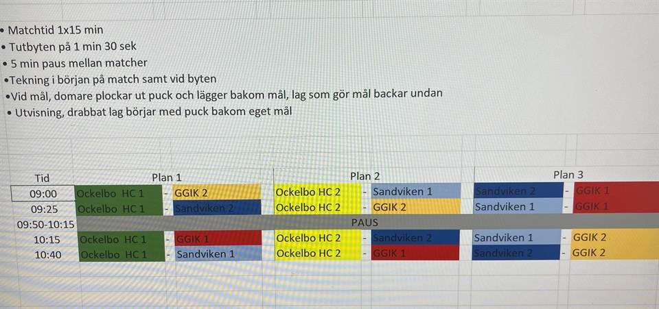 Hej, Här kommer lite info om sammandraget i Ockelbo för anmälda barn födda 2017 eller tidigare nu på söndag 9/3. Plats: Ugglebo arena Samling: Kl. 08.15 i Ockelbo Vi kommer ställa upp med 2 lag och spela totalt 4 matcher. Matcherna spelas 1x15 min med tutbyte 90sek. Vill man stå i mål så meddelar man resp. ledare detta. Mer info och spelschema i bifogat. Bilden läggs även upp på Facebook för bättre upplösning. Lagindelning: SIK 1 Viggo And. Ralf Elvin August Hjalmar Simon Rasmus Ledare: Patrik och Robin SIK 2 Pelle Ture Vincent Loke Lincon Henry Lias Ledare: Jacob och Anders Tänk på att komma utvilade och ha ätit en bra frukost. Det kommer vara en paus mellan match 2 och 3 där man kan fylla på med energi, så ta med nån mellis att äta i pausen. Inget godis eller läsk. Och glöm inte vattenflaska! Är det några funderingar får ni höra av er annars ses vi taggade på söndag. //Ledarna Hockeyskolan 6 mar 1kommentar