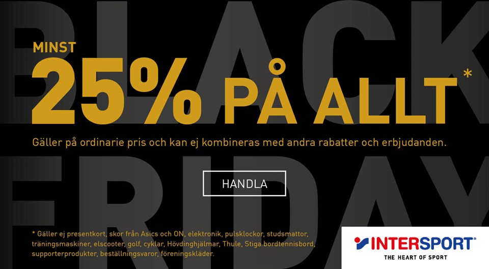 Black Friday på Intersport! Den 25–29 november firar vår samarbetspartner Inter­sport Black Friday och ger minst 25% på allt* + massa grymma superklipp. Passa på att köpa allt från fotbollsskor och kängor till vinterjackor, träningskläder och prylarna för idrottssäsongen. När du handlar på Intersport är du samtidigt med och stöttar vår förening. För du har väl valt vår förening att stötta extra på ”Mina sidor”? F -09/10 24 nov 2021 0kommentarer
