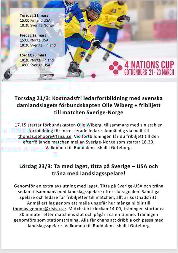 Hej! Under 4 Nations Cup finns 2 fina möjligheter för ledare och spelare i Höjden. En ledarutbildning och en möjlighet för lagen att träna med landslagsspelare. Se nedan för info, anmälan till Thomas Gehöör.