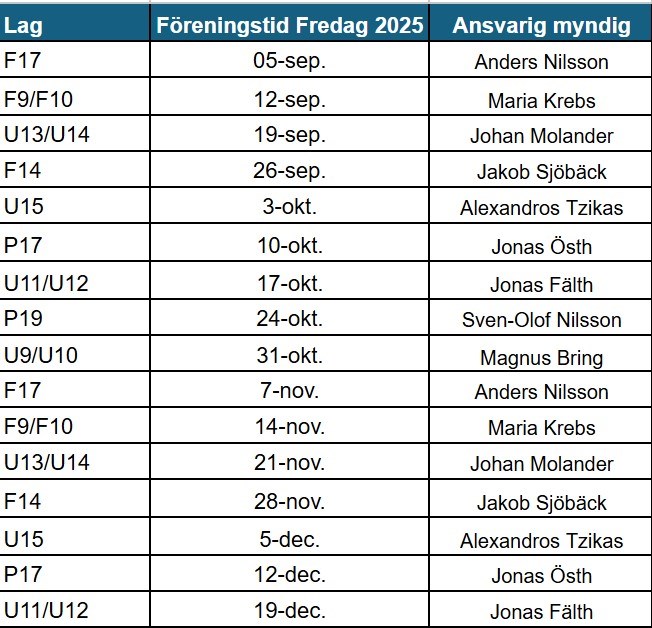Nu finns ett uppdaterat schema för ansvarigt lag och ledare för föreningstiden på fredagar för hösten 2025. Byt med varandra om ni får förhinder. Schemat finns under Länkar i dokumentet Ledare SK Höjden och i fliken Istider-25/26