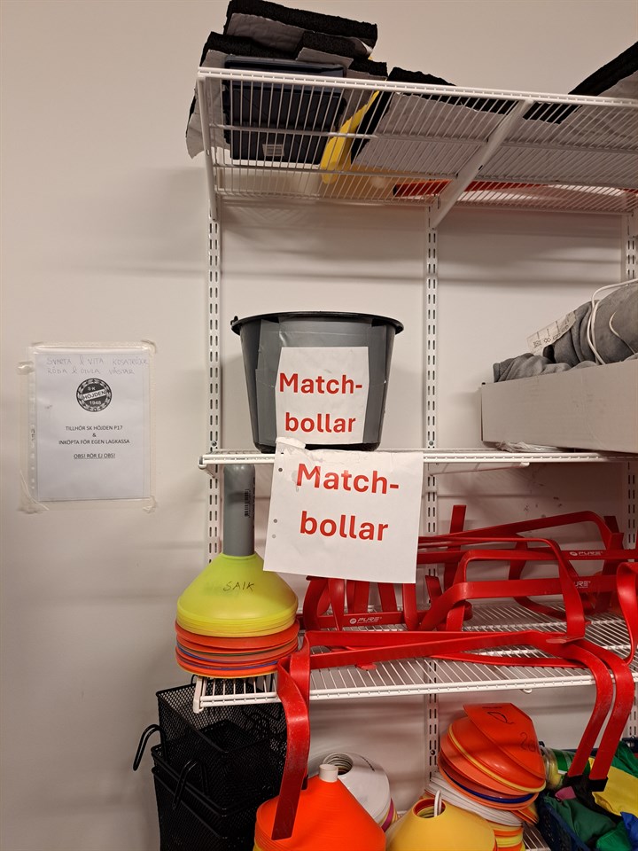 Jag har sorterat ut en uppsättning i hinken i förrådet enligt bilden - vänligen låt den vara vid träning så vi vet att det finns ok bollar när det är match.