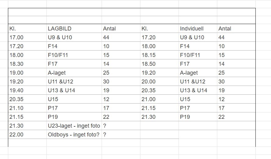 Mitt förslag är att alla lag är ombytta och på plats 30 minuter innan ert lagfoto så kanske det går att skynda på det hela lite.