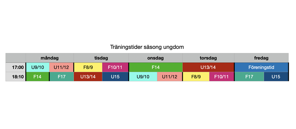 Här är schemat jag ritade på mötet igår. Meddela gärna mig om ni kom överens om några byten. Föreningstiden drar igån nu på fredag. Den är är 18:00-19:15 nu innan säsong och 16:30-17:45 sedan i oktober när skrinnarhallen får is,