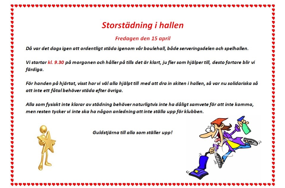 Storstädning av hela hallen fredag den 15 april kl 9.30. Förhoppningsvis blir det stor uppslutning så att vi blir snabbt färdiga. Alla insatser, stora som små, är välkomna denna dag.