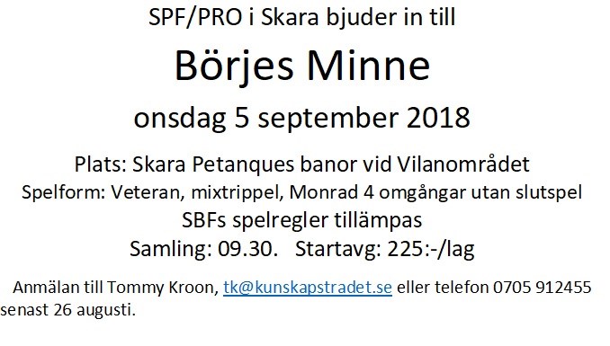 Hej Boulevänner! Börje Fransson var en eldsjäl och en stor profil i Skara Petanque. Vid hans bortgång bestämdes det att skapa en tävling till hans minne. Detta blir verklighet den 5 september, när vi bjuder in till våra utebanor vid boulehallen i Skara. Antalet startande lag är begränsat till 36 st, därför är det bra att vara ute i god tid. Du och Dina kamrater är mycket välkomna till Skara. SPF/PRO i Skara bjuder in till Börjes Minne onsdag 5 september 2018 Plats: Skara Petanques banor vid Vilanområdet Spelform: Veteran, mixtrippel, Monrad 4 omgångar utan slutspel SBFs spelregler tillämpas Samling: 09.30. Startavg: 225:-/lag Anmälan till Tommy Kroon, tk@kunskapstradet.se eller telefon 0705 912455 senast 26 augusti.