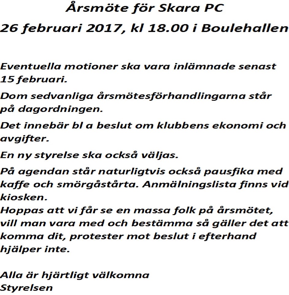 Årsmöte för Skara PC 26 februari 2017, kl 18.00 i Boulehallen Eventuella motioner ska vara inlämnade senast 15 februari. Dom sedvanliga årsmötesförhandlingarna står på dagordningen. Det innebär bl a beslut om klubbens ekonomi och avgifter. En ny styrelse ska också väljas. På agendan står naturligtvis också pausfika med kaffe och smörgåstårta. Anmälningslista finns vid kiosken. Hoppas att vi får se en massa folk på årsmötet, vill man vara med och bestämma så gäller det att komma dit, protester mot beslut i efterhand hjälper inte. Alla är hjärtligt välkomna Styrelsen