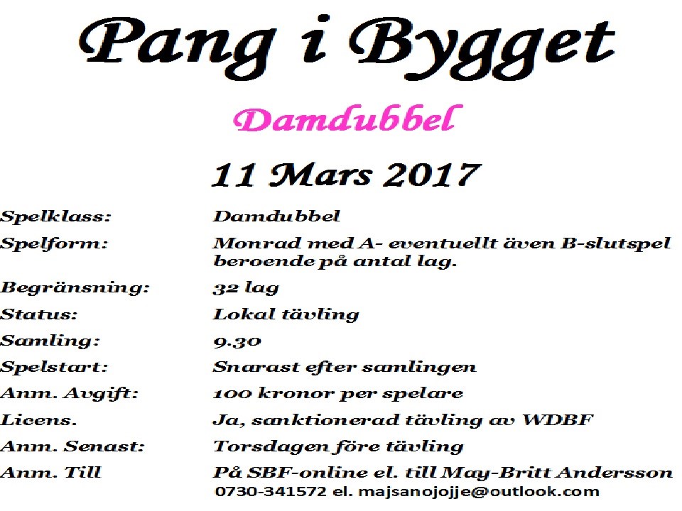 Pang i Bygget Damdubbel 11 Mars 2017 Spelklass: Damdubbel Spelform: Monrad med A- eventuellt även B-slutspel beroende på antal lag. Begränsning: 32 lag Status: Lokal tävling Samling: 9.30 Spelstart: Snarast efter samlingen Anm. Avgift: 100 kronor per spelare Licens. Ja, sanktionerad tävling av WDBF Anm. Senast: Torsdagen före tävling Anm. Till På SBF-online el. till May-Britt Andersson 0730-341572 el. majsanojojje@outlook.com Förfrågningar: May-Britt Andersson, 0730-341572 Servering: Det sedvanliga bouleutbudet med kaffe, smörgåsar, korv m. bröd, kakor, godis. Välkomna till Skara!!