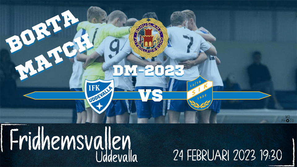 Ny match i DM och Grupp A väntar mot favoriterna IFK Uddevalla. Uddevalla spelar i Division 3 efter att ha vunnit vår serie förra säsongen. Därmed får de väl anses vara favoriter. Uddevalla vann premiären mot Stala IF med 7-2. Vi har åkt på ett rejält manfall till denna match. Mycket sjukdomar, ett par skador och arbete gör att vi åker till Uddevalla med 12 utespelare och 2 målvakter. Men det är en stark trupp trots det. Avspark är 19:30 i Uddevalla, på Fridhemsvallen. Vi får se om det uppdateras på Forza Football. Truppen till matchen: Waleed Al Khatep Akbar Musavi Hampus Wallin Charlie Wolfbrandt Jonas Andreasson Carl Thorén Peter Fransson Andreas Bengtsson Filip Thonell Niklas Andersson Emil Larsson Albin Kindstrand-Bolger Theo Toresson Hugo Wolfbrandt