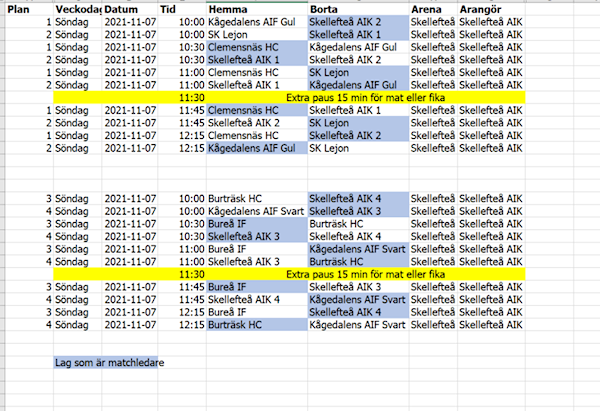 • Lag i blått är matchledare på matchen, alla lag är matchledare två matcher var: