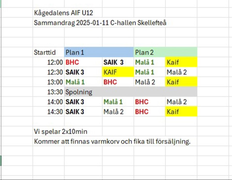 Hej! Vi anordnar matchsammandraget i c-hallen kl. 14:30-20:45 den 19 januari. Samling kl. 13:30 för att rodda planer och förbereda fikaförsäjlning samt hamburgegrillning. Arbetsfördelning enligt nedan: Rodda planer och tidtagning: Melker, Hugo, Melvin och Viggo. Fikaförsäljning/grillning Loui C, Leo, Theodore och Eije. Samtliga föräldrar på plats får hjälpas åt med arbetsuppgifterna, så att alla hinner se några matcher. Ett sms kommer så att ni i gruppen kan bestämma vem som bakar med mera. Mer information finns under Dokument/Fikaförsäljning. Lagindelning kommer. Mvh/Ledarna U13 12 jan 0kommentarer