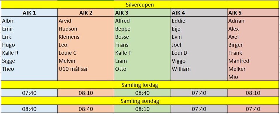 Hej! Vi hoppas att alla har koll på vad som förväntas av vardera spelare/föräldrar i form av lotterivinster, sponsring och arbetsinsats under Silvercupen (se under Dokument/Silvercupen). Vi kommer dock inte att ha någon fikaförsäljning, eftersom AIK kommer ha en kiosk öppen. Det innebär att alla inte behöver baka! Vardera spelare (eller föräldrarna) i sek-gruppen ska dock baka en långpanna eller motsvarande till ledare-/domarfika. Att lämna in i Sportbaren på lördag (16/3) morgon. I övrigt så har det gått trögt med att få sponsring på framför allt frukostgrejer. Vi avvaktar dock svar från något företag, och har blivit lovade rabatt från en butik om vi handlar av dom. Vi kan komma att behöva ta ut en mindre avgift per spelare om det behövs. Vi påminner om inlämning av lotterivinter på måndag 11/3 i samband med träningen, vi finns vid sektion H från kl. 15.30 (se tidigare utskick). I nästa vecka kommer spelschema, lagindelning och mer praktisk information kring cupen. Hör av er till cupgeneralen (Jenny) om ni har några funderingar. Vi ser fram emot en spännande helg 16-17 mars! Mvh/Ledarna U13 7 mar 2024 8kommentarer