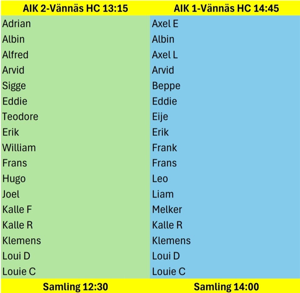 Hej, Efter gårdagens föräldramöte har vi nu, efter bästa förmåga, gjort en fördelning av arbetsuppgifterna inför matcherna nu på lördag. Vi kommer att se över innehållet i fikalådan och komplettera med det som saknas, inklusive inköp av bullar. Om någon har möjlighet och vilja att baka något tas det tacksamt emot. Match 1 - start 13:15 Fikaförsäljning: Loui D, William OVR: Erik Bås: Louie C Tidtagning: Theodore Speaker: Kalle F Match 2 - start 14:45 Fikaförsäljning: Klemens, Frans OVR: Erik Bås: Eije Tidtagning: Beppe Speaker: Axel E U13 2 okt 0kommentarer