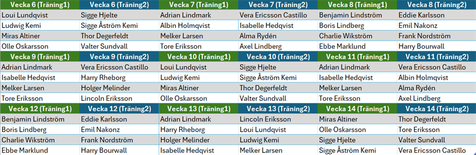Schemat gäller för träning 1 och 2 varje vecka. Ibland kan vi även ha en tredje träning och till den är det först till kvarn som gäller (Har man egen utrustning får man givetvis stå dessa träningar). Skulle det vara så att vi bara får en eller ingen träning tilldelad t.ex under jul och nyår så kommer de som har träning1 stå om vi får 1 träning. Får vi ingen träning så utgår båda.