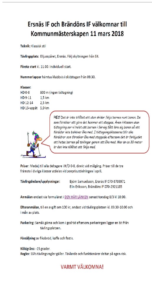 Nu finns inbjudan till årets KM i Ersnäs ute. Vi ser gärna att alla Baikare åker på detta så det är sista tävlingen för säsongen och det är ett fint tillfälle att så smått börja avrunda säsongen, i förhoppningsvis solsken och bra temperatur. Alla i de yngsta klasserna får dessutom en medalj! Vi gör som i tidigare anmälningar att ni anmäler er via laget.se (!) och inte via egna anmälningar till arrangören. Svara på den inbjudan som kommer ut och svara gärna både om ni kommer och om ni inte kan komma så vi vet. Vi behöver ert svar senast torsdag den 8/3 kl 16.00. Se mer info om tävlingar i bifogad bild. Skidor 1 mar 2018 0kommentarer