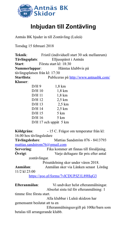 På torsdag är det skidzontävling för barn från 2009 och äldre i fristil i Antnäs. Pga det strulat lite grann med infon så behöver vi att alla som vill vara med anmäler sig IDAG kl 21.00 senast. Anmäl er genom att svara på kallelsen som de i aktuell åldersgrupp fått så gör vi en gemensam klubbanmälan. Ingen ska alltså anmäla sig i formuläret i inbjudan! För övrig info se inbjudan. Övriga som inte ska på tävlingen är välkomna på träning kl 18.00 på torsdag! Boka också in zontävling för barn födda 2010-2012 tisdag den 20/2, mer info och anmälan kommer i veckan. Skidor 11 feb 2018 0kommentarer