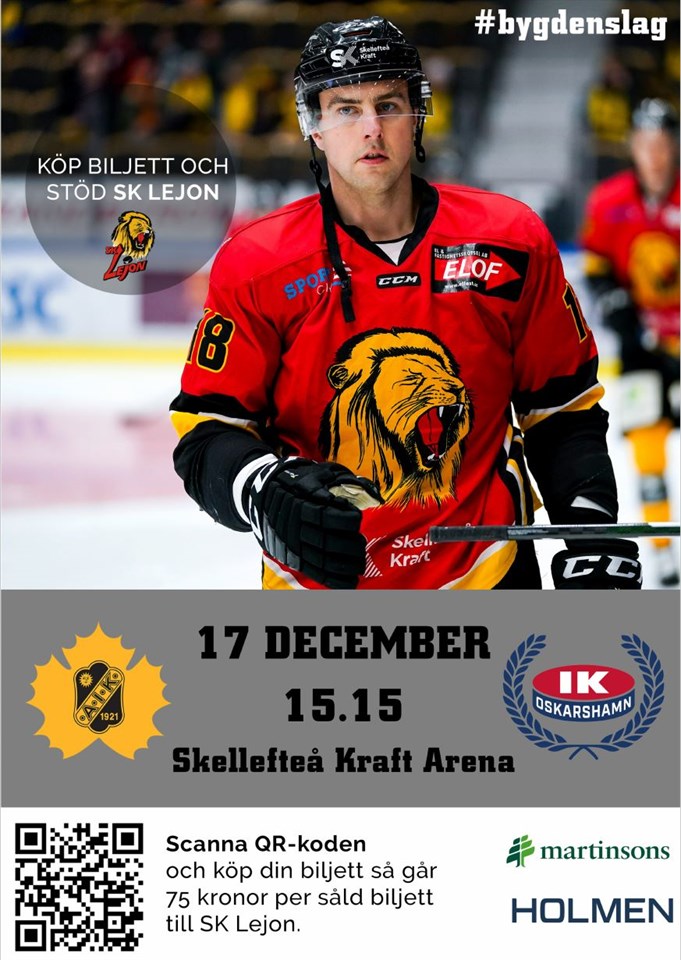SK Lejon är Bygdens lag imorgon lördag i matchen Skellefteå AIK - IK Oskarshamn. Köp en biljett med länken så går 75 kr till SK Lejon. https://ske.ebiljett.nu/Campaign/ShowCampaign/BLLejon